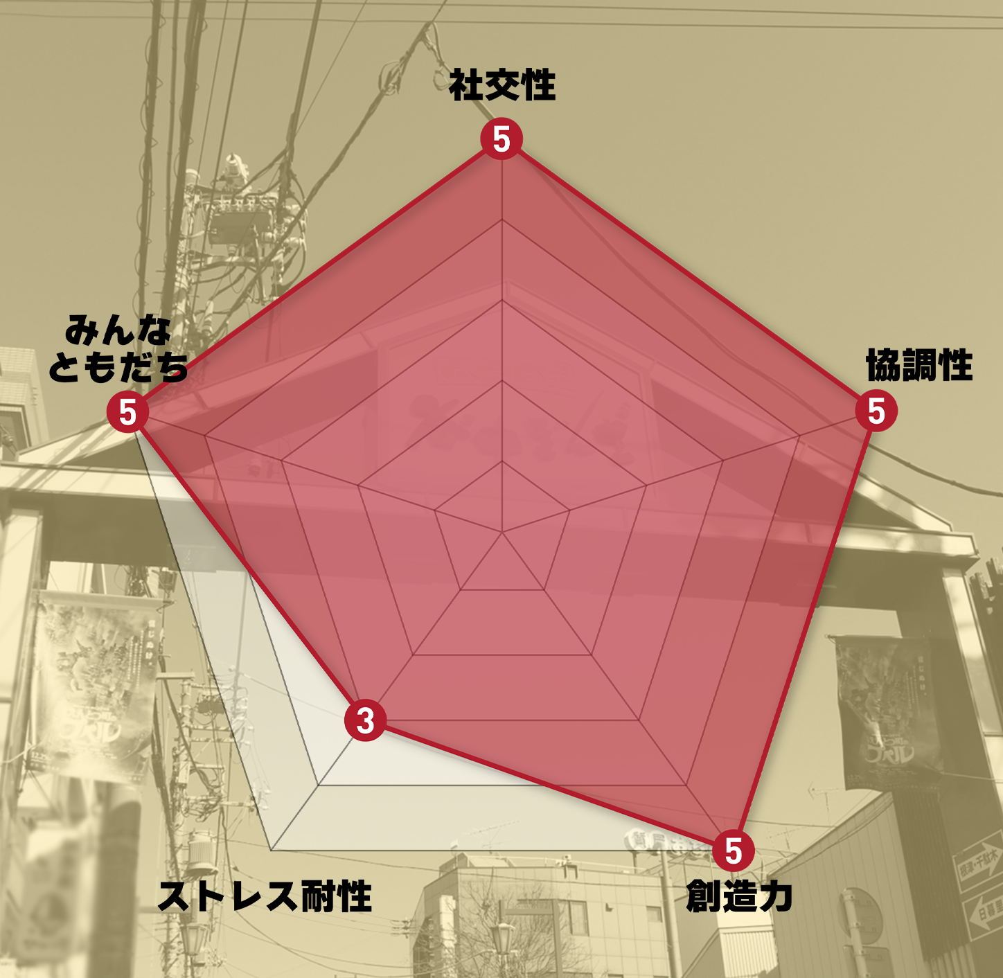 面倒見の良い兄貴肌の青年。人情深く親しみやすさがあり、どんな相手とでもすぐ仲良くなれるのが特技だが、子どもの頃は超がつくほどの引っ込み思案な性格だったという。初めての一人暮らしで困っていた西日暮里駅・諏訪をルームシェアに誘った。家事全般が得意で、特に裁縫の腕はプロ顔負け。ステージ衣装も自分で手作りしている。
